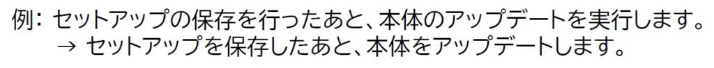 それから、細かいことですけれども、マニュアルでは、「~を行う」「~を実行する」というふうに書く場合が多くなっていますが、これをやめて、下の例のように「~する」とシンプルな形で記載をしていくと誤訳を防ぐことができます。