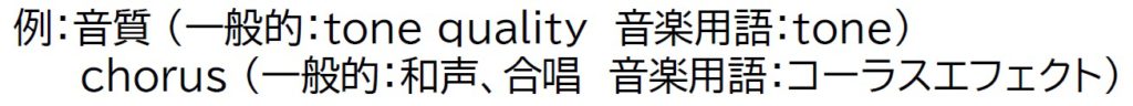 逆に英日の例ですが、「chorus」という言葉は、一般的には「和声」とか「合唱」とか訳されますが、音楽用語では、音に効果をかけるという意味の「コーラスエフェクト」のことを指します。こういったところで、間違えて訳されることが多いです。